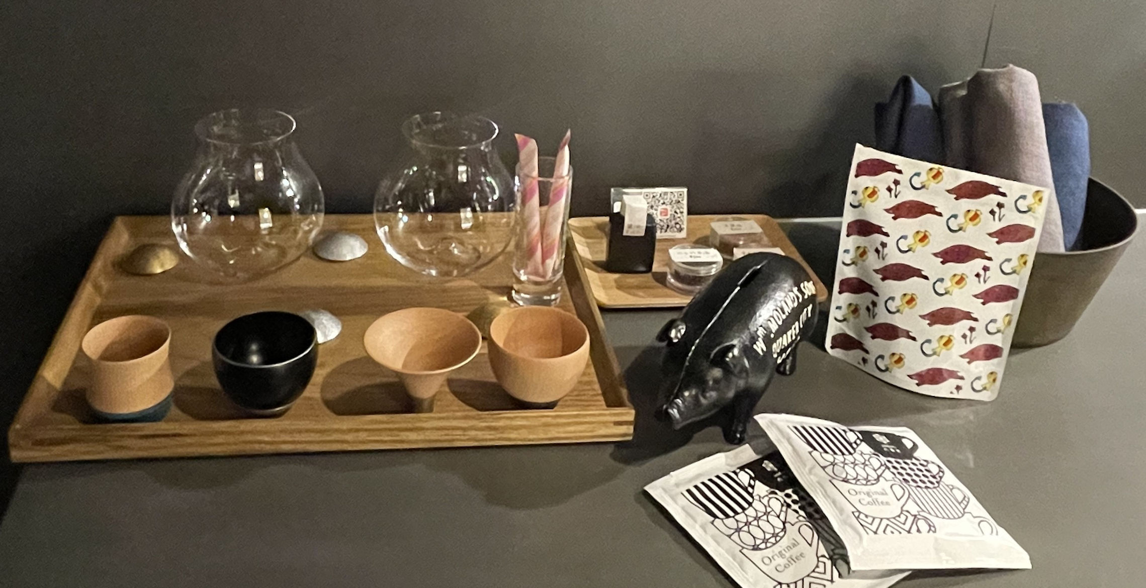Ganz anders der Showroom im Erdgeschoss, in hellem Holz, schlicht, sehr gut beleuchtet. Hier zeigt er seine neuen Kreationen, handgemacht, in modernstem Design unter dem Markennamen KISEN : Glöckchen für die Zen Meditation aus dünn geschliffenem Holzbody und kupferfarbenem Klangkörper, kleine Klangschalen und Räucherstäbchen Becken. Wir bewundern die Entwicklung eines federleichten Rotweinschwenkers, der über ein pyramidenförmiges Drehlager aus Metall geschwenkt wird, Sake Becher aus Bambus oder Holz mit verschiedenfarbigen Metallfüßen, Untersetzer für Sushi Dekorationen. Stäbchen Bänke in verschiedenen Metalltexturen, Metall-Untersetzer für die Küche, Wein und Sake Accessoires, schlichte Vasen in verschiedenen Farben.