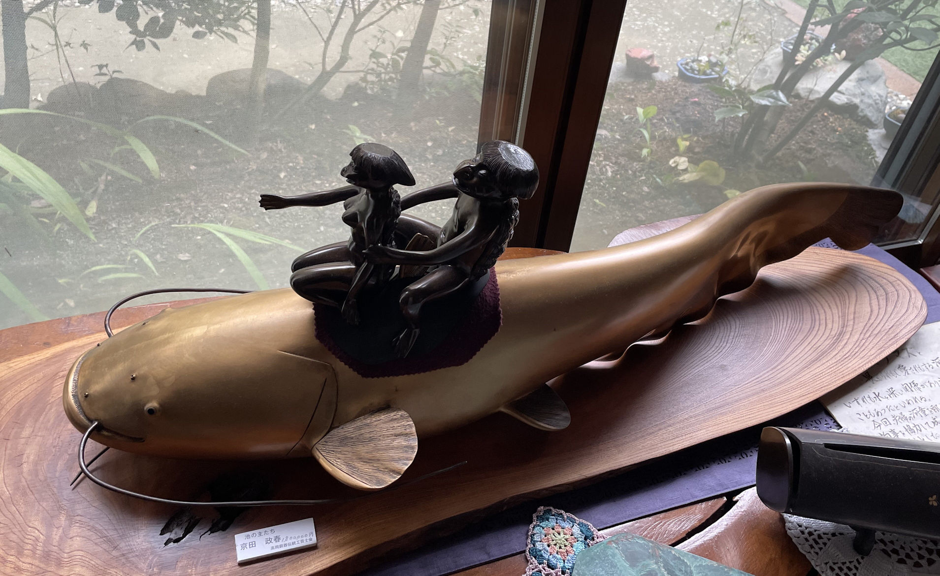 Nichts was wir lieber täten und sind gespannt wohin uns Yotsugawa-san fährt. Hinter einem Einfamilienhaus befindet sich die Werkstatt von Masaharu Kyoden, einem bekannten japanischen Künstler, der Bronzefiguren und Vasen entwirft und herstellt. Der Meister steht vor einer grünlichen, bauchigen Bronzevase auf der zwei Welse zwischen Lotusstengeln im Wasser treiben. Es ist sein neuestes Werk und noch nicht ganz vollendet. Interessant ist, dass der Meister nicht als Künstler vorgestellt wird, sondern als traditioneller Handwerker. Seine Preise allerdings, lassen auf einen bekannten Künstler schließen. Sein neuestes Werk in grünlichem Bronze 28 cm hoch und 36 cm Umfang, soll Yen 2.000.000 – etwa EUR 12.500 kosten. Er lädt uns in sein Haus ein, eine Schatzkiste mit seinen Bronzewerken. Eine Vase mit einem besonders fein gearbeiteten Drachen hat es uns angetan. Preis nur Yen eine Millionen – etwa EUR 6.200. Für einen Künstler mit Auszeichnung vom japanischen Kaiser, eigentlich preiswert…
